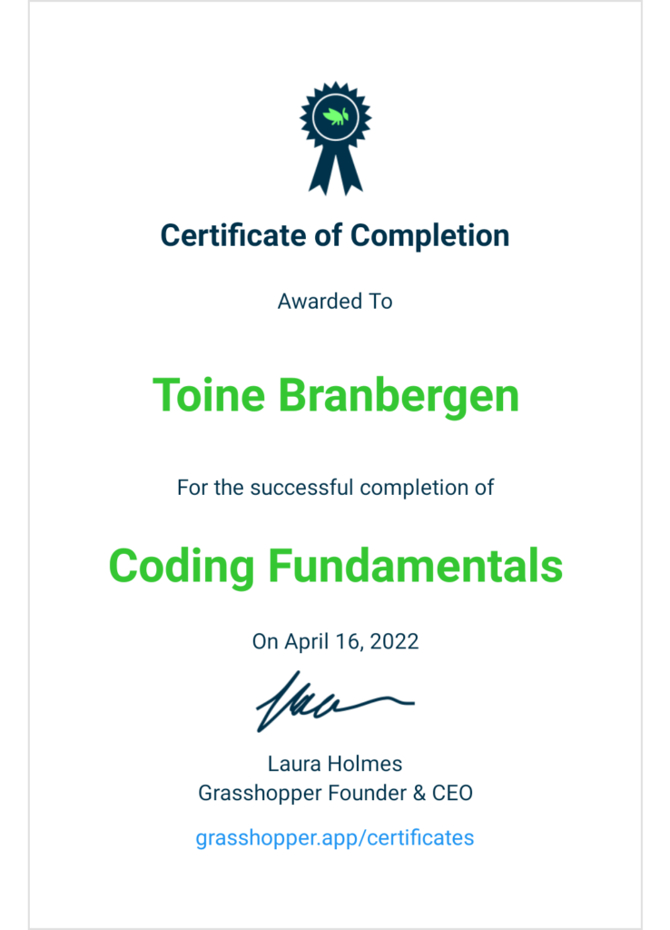 - Certificaat voor javaScript fundamentals in de GrassHopper app