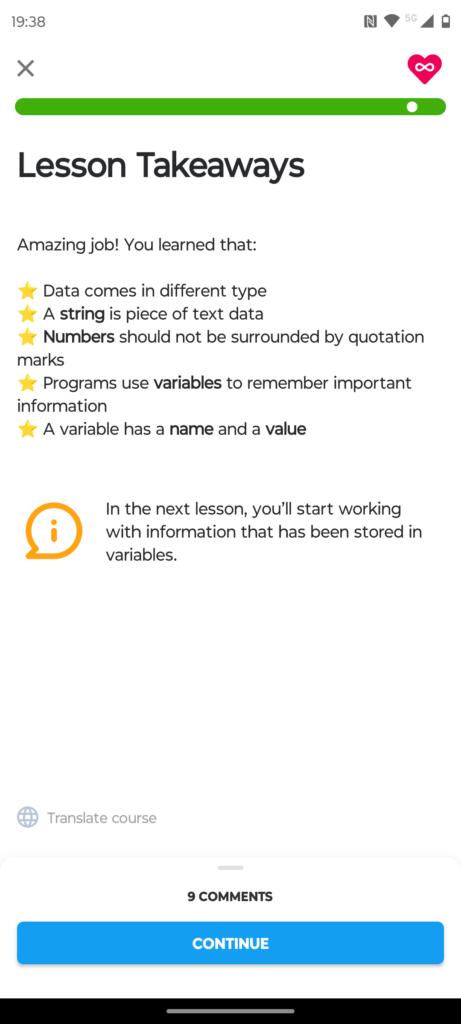 De lessen worden al iets interessanter en gaande weg leer ik toch weer nieuwe dingen ondanks dat het weer vanaf het begin is. Voorlopig blijf ik lesjes in Sololearn volgen wegens drukte en moeheid.