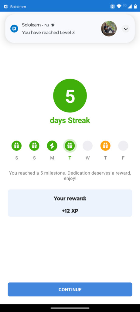 Herhaal oefeningen .. level 3 en 5 dagen streak in SoloLearn #verslavendlekker