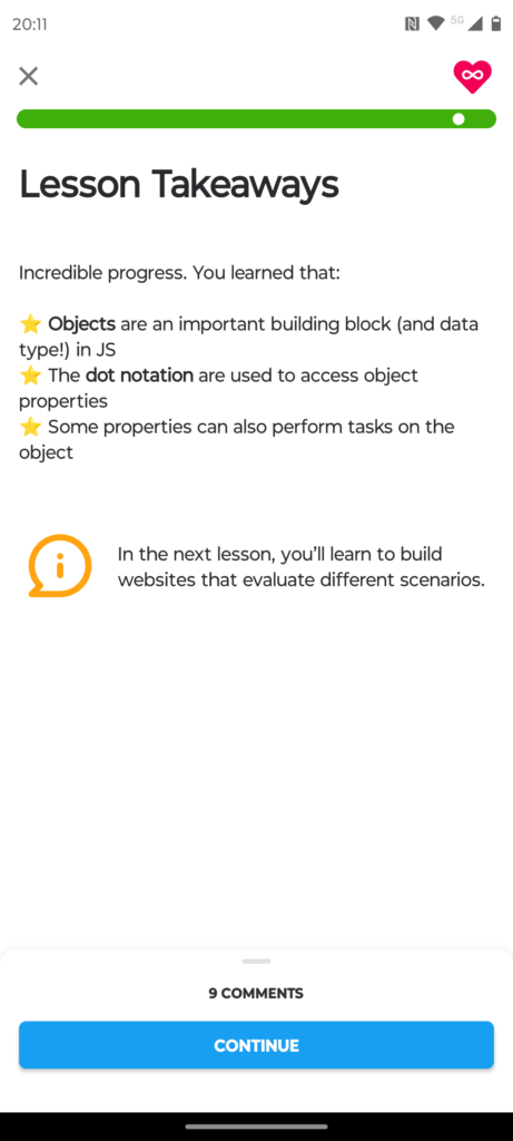 Korte sessie want vrouw en kleine beiden ziek. Desondanks een kick off met objecten in de JavaScript intermediate course op SoloLearn.